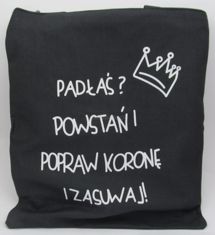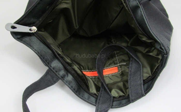 Dizajnersko emejzingowa torba z napisem. Dodatkowa kieszeń. Zapinana na suwak zarówno torba jak i kieszeń. Środek torby wyściełany podszewską.